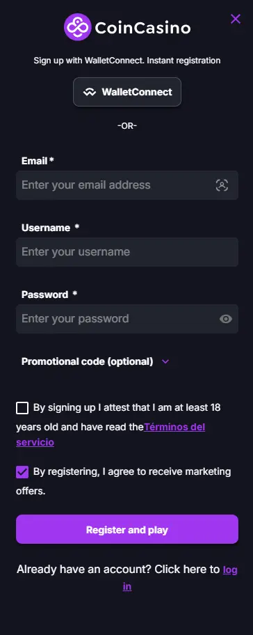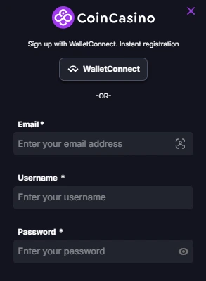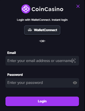 Signing up is simple. Go to CoinCasino’s site and click “Sign Up”. Enter your email, choose a username and password, then verify your email. Alternatively, you can use WalletConnect to link a crypto wallet and skip most steps. Once your account is created, click “CoinCasino login”, enter your credentials (or use your connected wallet), and you’re in. The whole process takes less than a minute.
